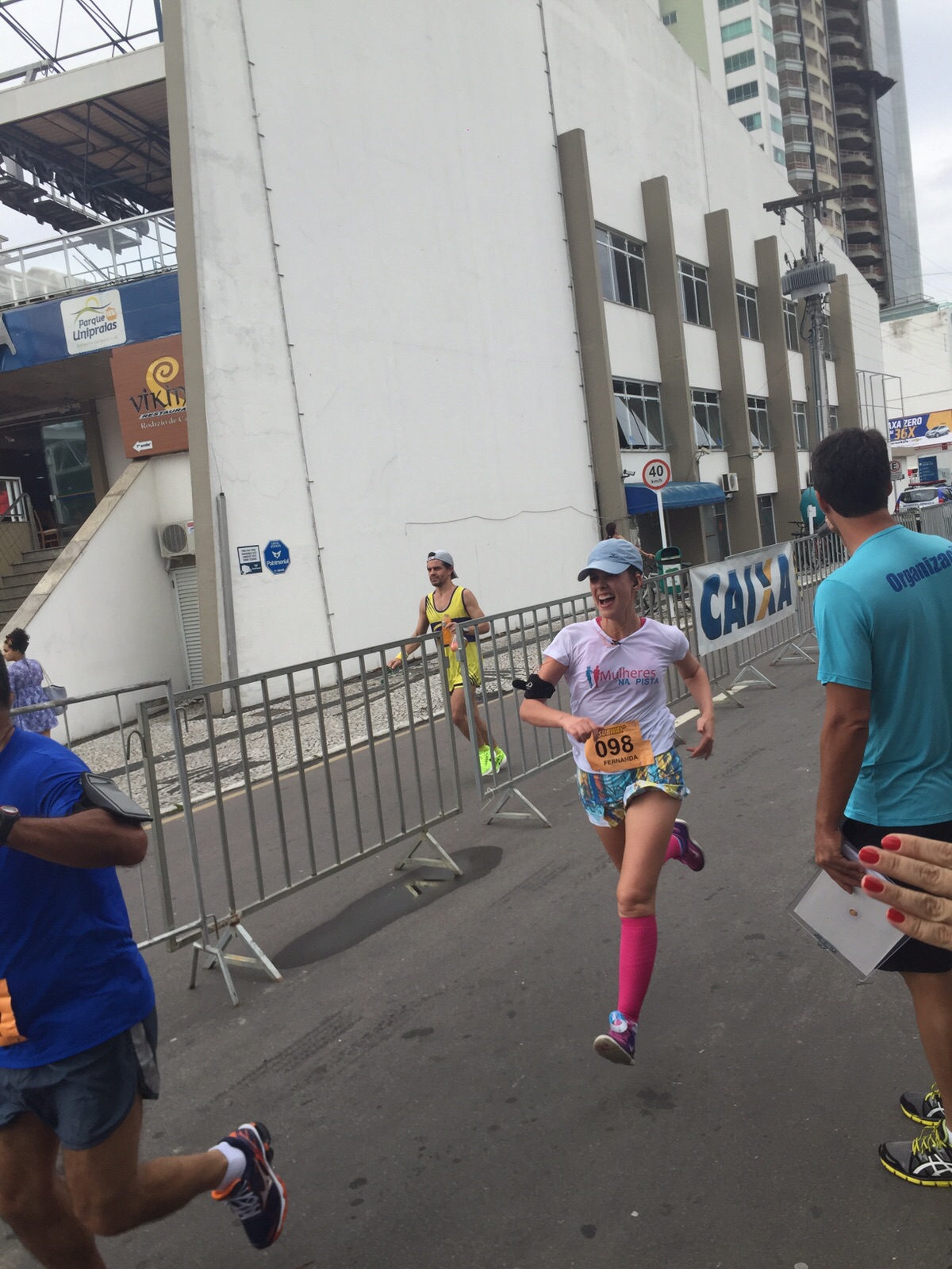 No km sete minha cabeça lutava, parte dizia para eu caminhar e a outra dizia para eu terminar a prova correndo, mesmo que devagar. A parte mais teimosa ganhou e eu segui correndo.  Achei que faria um tempo ruim, um dos piores.  Mas quando chegava ao pórtico de chegada vi que fazia o meu melhor tempo. E assim foi. Fiz a prova em 1h02.  Fiquei chocada! E feliz. E ainda no fim pude abraçar meus amigos e a minha linda Carol. Que orgulho dessa guerreira!