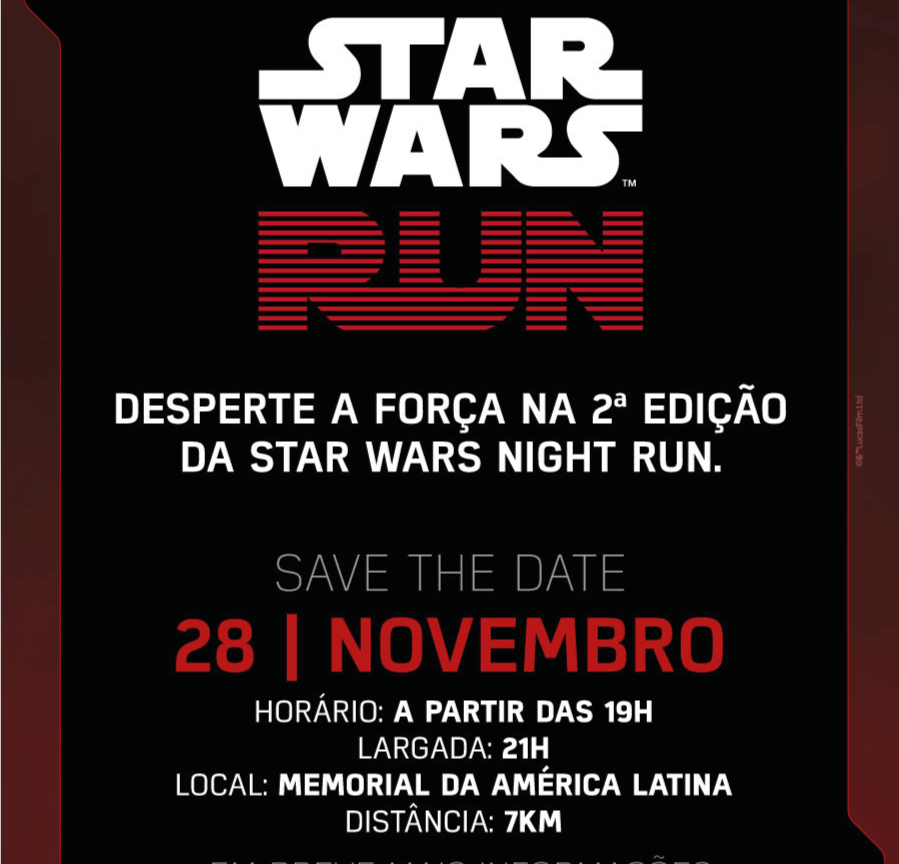 O fim do ano será mesmo um período que os fãs da saga criada por George Lucas vão comemorar. Além do lançamento o mais recente filme da série, Star Wars: O Despertar da Força, no dia 17 de dezembro, os seguidores da força – do lado negro dela ou não – podem separar o par de tênis para percorrer os 7 km da 2ª edição da Star Wars Night Run.