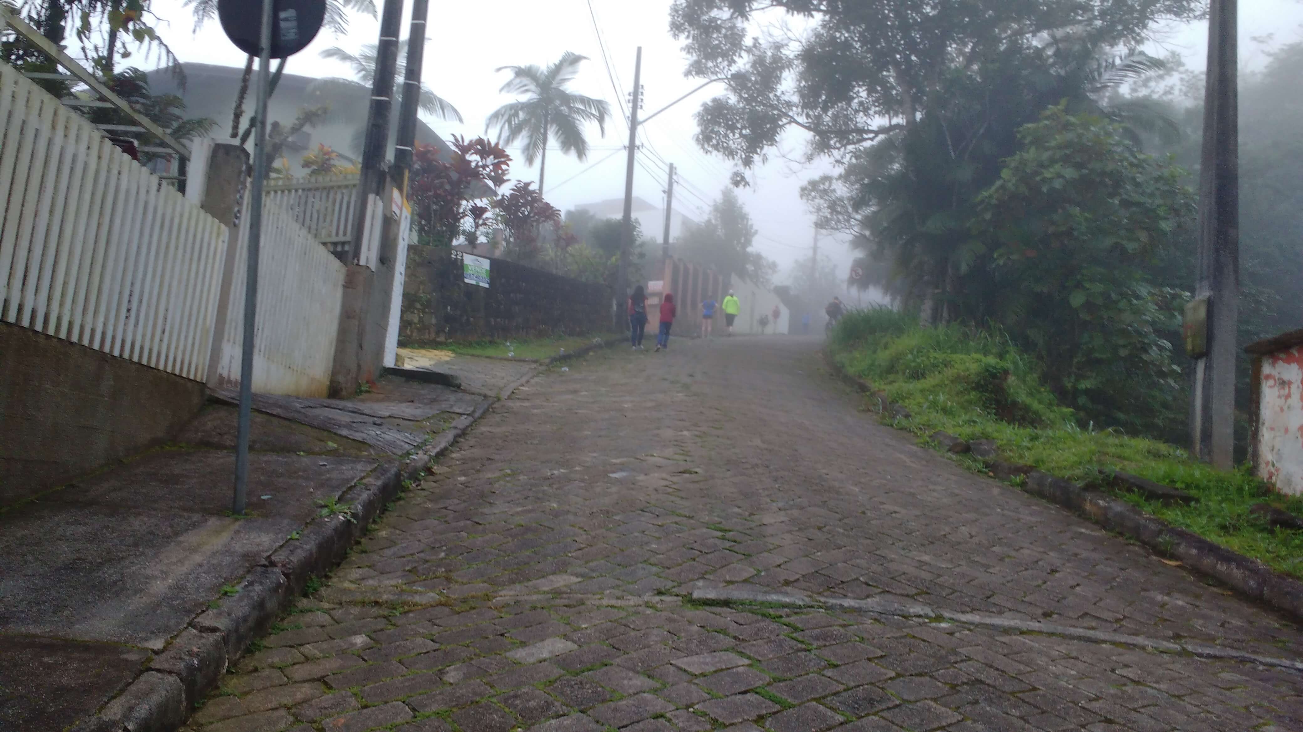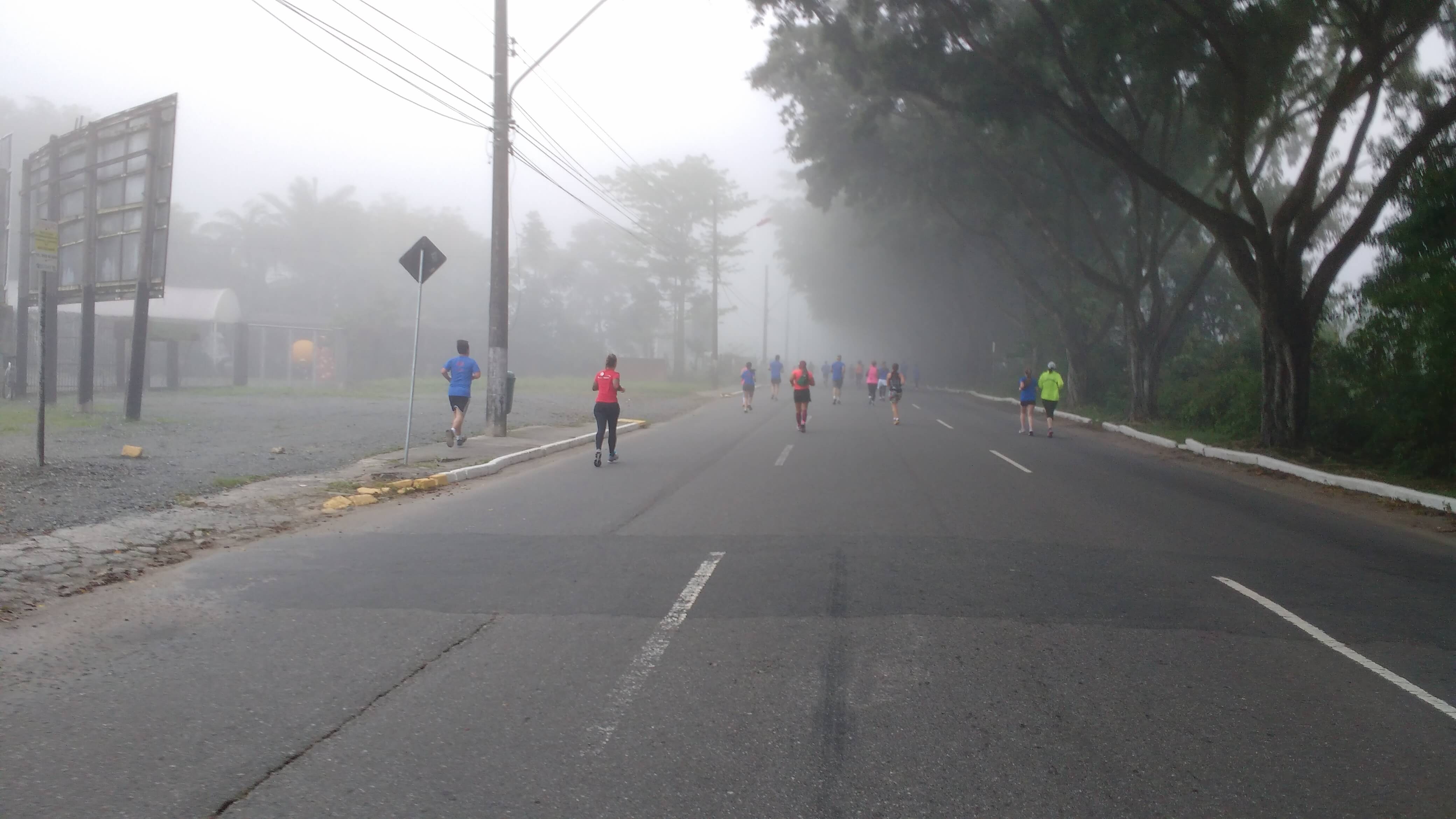 A largada estava marcada para às 7h30 da matina. Em frente ao Fórum de Joinville. E todos estavam lá reunidos aguardando a largada. A neblina escondia o percurso, e o Mirante que nos esperava ao fim da prova. Cheguei e encontrei os amigos da CBS e Mulheres na Pista, todos animados. A prova, com seis quilômetros de distância, estava prestes a começar. Aquecimento e exercícios de mobilidade feitos, fomos para a largada.
