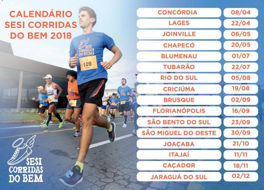 O Sesi divulgou o calendário de 2018 do Circuito Corridas do Bem. Serão realizadas 16 etapas em todas regiões do Estado. Além das provas de 10k e 5k, os participantes poderão se inscrever para a caminhada e levar as crianças para a maratoninha. Um evento para toda a família, como podem ver.