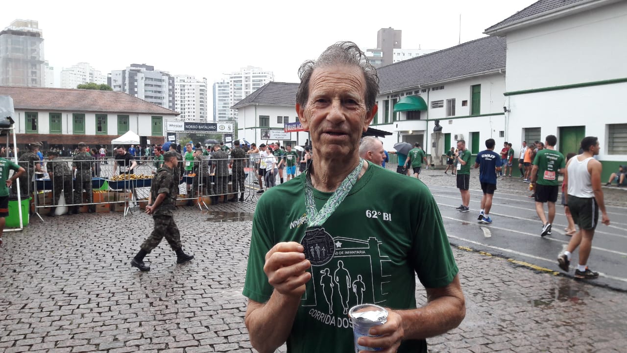 Quem também marcou presença no evento foi o Monsenhor Bertino, que do alto dos seus 80 anos levantou cedo para participar da caminhada de 3k – foram duas voltas em torno do Batalhão. “A prova foi muito boa. Pena que passou rápido. Por mim eu daria mais uma volta. O tempo chuvoso também ajudou. Não estava tão calor. A chuva também é bênção de Deus”, diz ele, que ainda joga basquete duas vezes por semana e garante que o sucesso para a saúde e a longevidade é levar a vida com alegria.