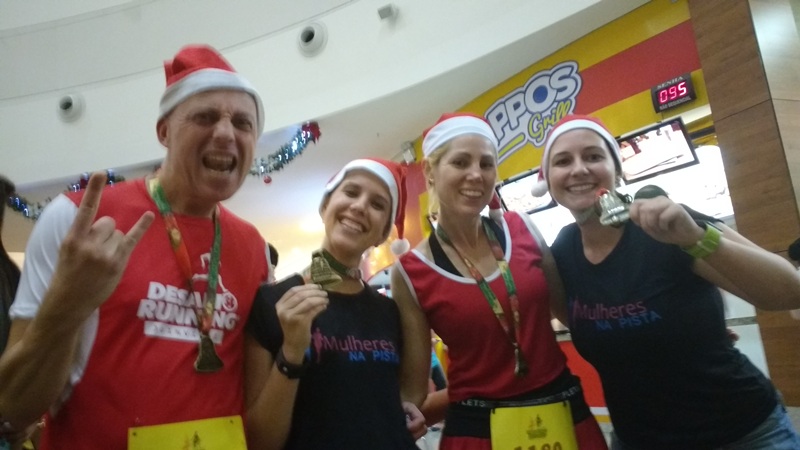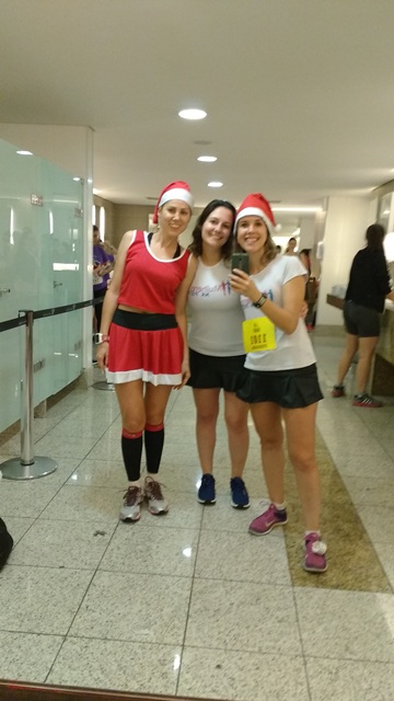 A July mandou fazer uma roupa de Mamãe Noel, afinal quem corre fantasiado participa de sorteio de vários brindes. Carol e eu fomos de uniforme, saia preta e camiseta das Mulheres na Pista, e o gorro de Natal fofo que vem no kit.
