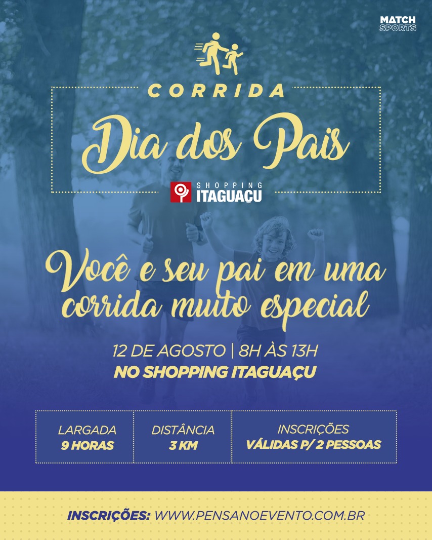 A Corrida Dia dos Pais é uma realização da Match Sports e do Shopping Itaguaçu, que estão preparando um superevento para comemorar a data especial. Será um dia de muita atividade física, saúde e declarações de amor. Será um dia de fortalecimento de relações. Sim, porque a proposta da prova é de que pais e filhos corram juntos essa supercorrida.