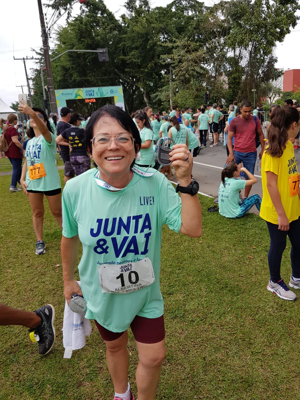 A jornalista Albertina Camilo, de 54 anos, estava com muito medo de passar vergonha, de “não dar conta” de correr/caminhar quatro quilômetros. O incentivo de uma amiga foi essencial para aceitar o desafio. Ela conseguiu terminar o trajeto na maior alegria e ainda “com fôlego”. E decidiu: foi a largada para uma mudança de vida em relação aos cuidados com o corpo e a saúde. O dia 23 de setembro de 2018 ficará guardado na memória. “Próximas corridas, me aguardem!”, avisa.