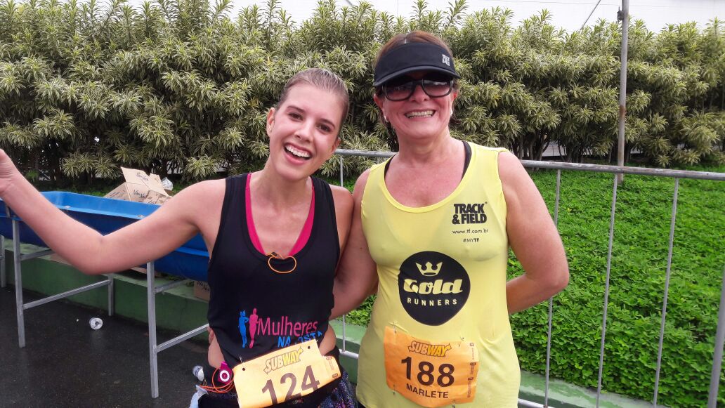 Passei e fui passada por várias pessoas que, assim como eu estavam revezando corrida e caminhada. E chegamos, finalmente ao km 5 para retornar. Ali peguei dois copos de água e tomei meu carbo em gel quando deu 45 minutos de prova. Como não tomei toda a água dos dois copos ofereci a metade de um que sobrara para uma senhora que estava sofrendo de calor como eu, e fomos, nós duas revezando, até que mais pra frente na prova fomos lado a lado e perguntei o nome dela: é Marlete Peixer Zoboli, a mãe da Deia, a nossa Mãe na Pista! Fomos uma incentivando a outra, nessa prova que foi um desafio imenso. (ah, a mãe da Deia ainda ganhou troféu na categoria, que orgulho!)