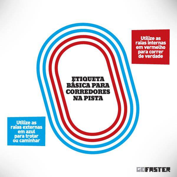 Se você for fazer treinos de tiro ou correr mais rápido, utilize as raias do lado de dentro da pista. Quanto mais rápido, mais para dentro. Se for caminhar ou trotar, utilize as raias do lado de fora. Conforme o desenho abaixo, feito pelo pessoal da Go Faster.