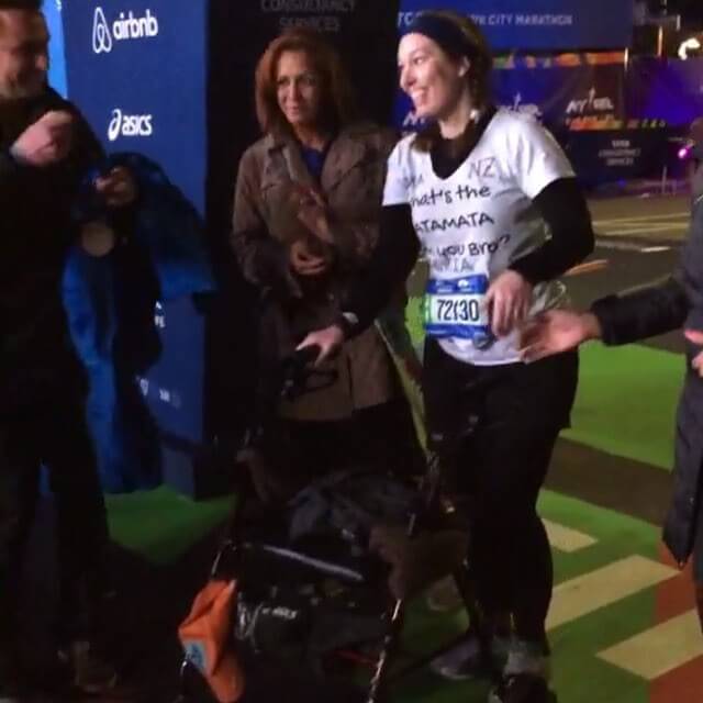 A primeira delas eu compartilhei na fanpage das Mulheres na Pista. Saskia van Waaijenburg fez uma cirurgia na coluna vertebral em setembro. Ela conta, aqui você confere o link da entrevista em inglês, que, de uma menina super positiva, ficou dependente de remédios para dor e começou a ter pensamentos suicidas. Mas, a partir do momento em que decidiu fazer a maratona, isso mudou a sua vida. Saskia foi uma das últimas pessoas a terminarem a maratona,fez a prova com a ajuda de um andador com rodas. Ela conta também que o namorado – que ajudou a cuidar dela após a cirurgia, assim como sua mãe – teve que esperar mais de 4 horas após ele mesmo ter terminado a prova, até a chegada de Saskia. Na linha Saskia teve a companhia do namorado e das amigas.