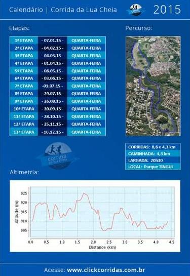 Infelizmente, as inscrições já foram encerradas. Mas já aviso: assim que terminar esta prova serão abertas as inscrições para a 5ª etapa, que ocorrerá no dia 6 de maio. Informações aqui. Confira abaixo o calendário da Corrida da Lua Cheia.