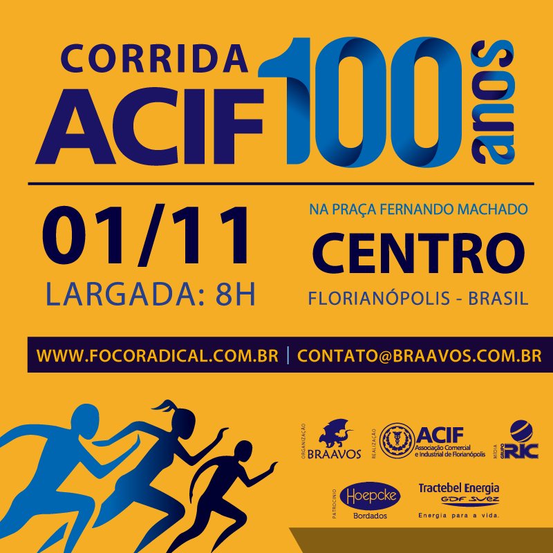 Com percurso que destaca o centro histórico de Florianópolis, a Corrida ACIF 100 anos está com inscrições abertas até esta terça-feia, 27 de outubro, aqui. Há opções para todos os gostos: caminhada (3k) e corrida (5k e 10k), que passarão pelos principais cartões-postais da cidade.