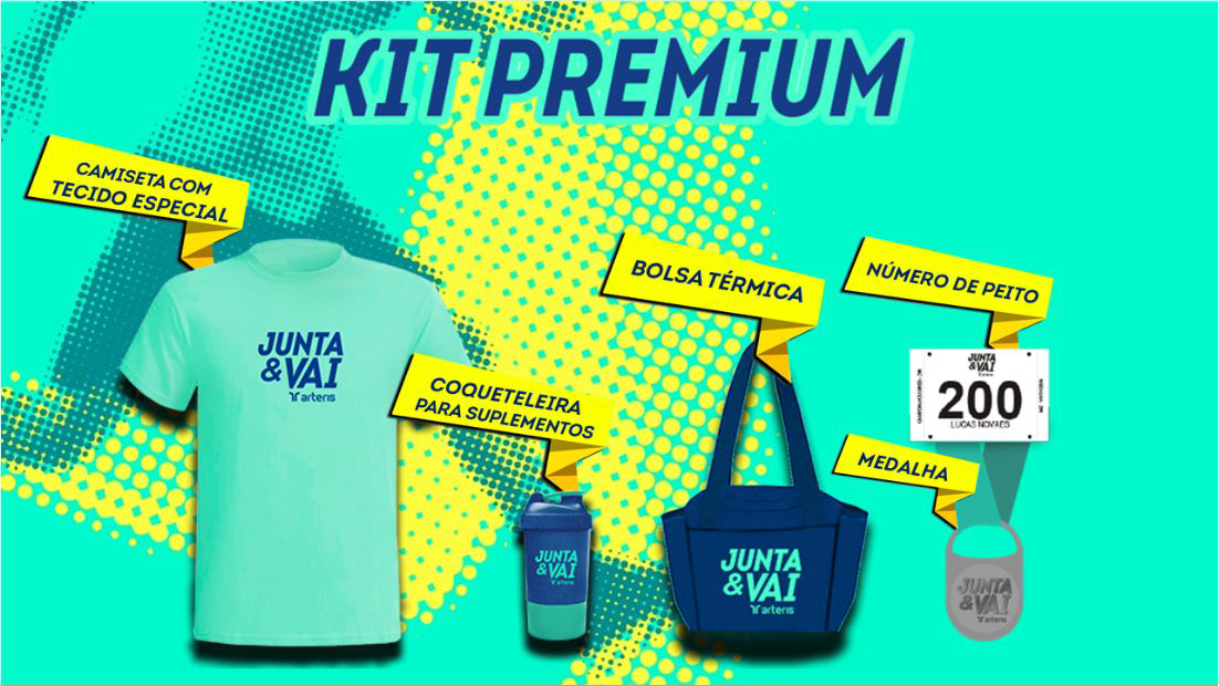 O Kit Premium, por sua vez, traz uma bolsa térmica e uma coqueteleira para suplementos, além da camiseta, medalha e número de peito.