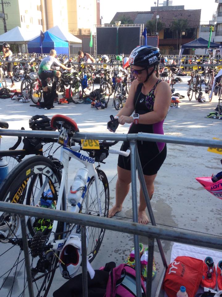 Largamos. Até a primeira boia foi difícil até conseguir sair da muvuca. Fiz um ótimo tempo na natação: 1.980 metros em 32 minutos. Nadei me sentindo muito bem e confiante!