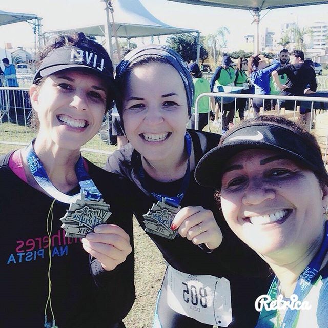 Encontrei o restante dos amigos, peguei medalha, água, frutas, fiz fotos. Depois ficamos Maria Fernanda e eu jogadas no chão, semimortas, junto com a Laryssa, esperando o Juan e o Juliano pegar o carro.