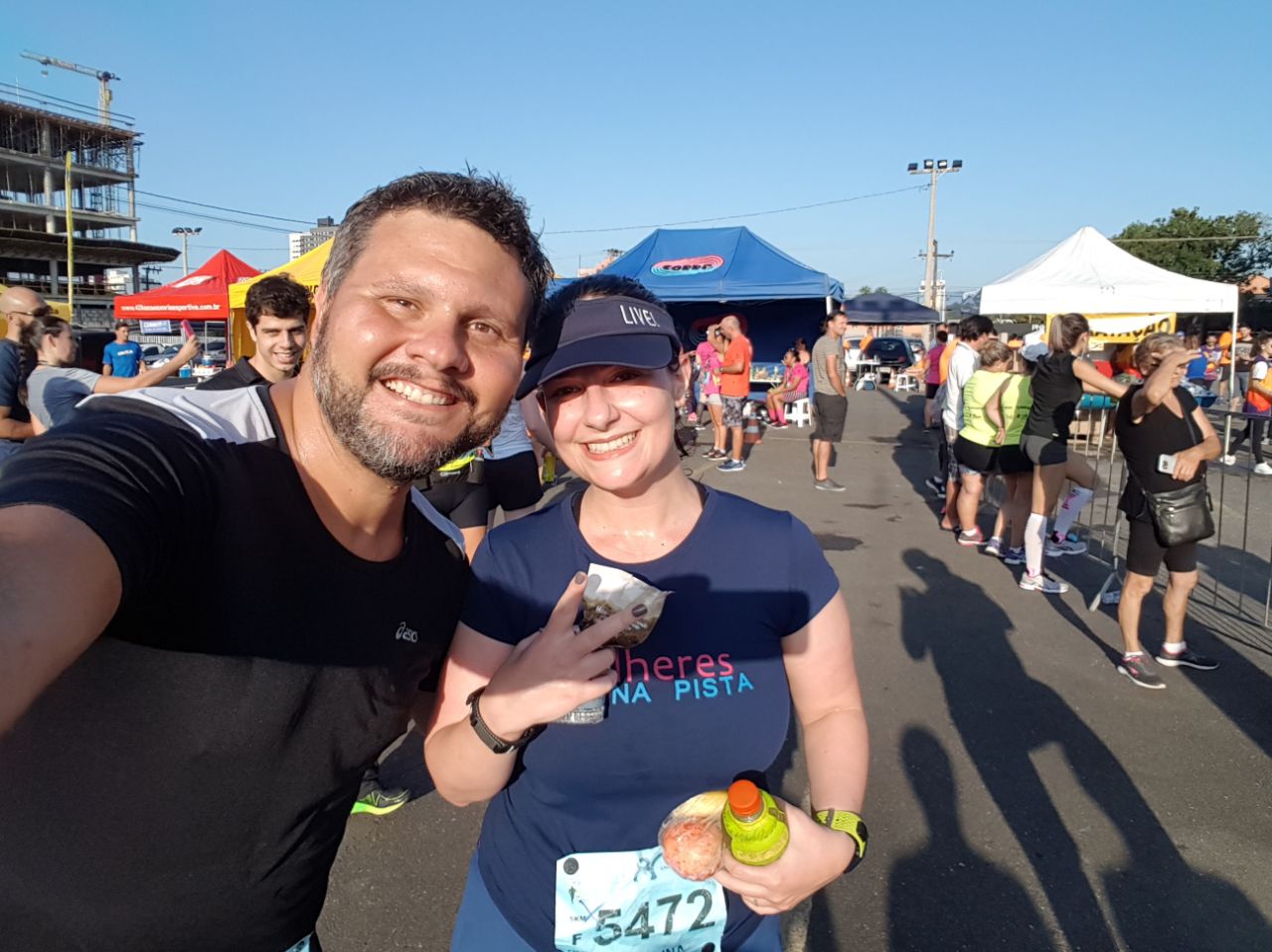Pouco depois do km 2, senti um cansaço extremo e as panturrilhas queimando. Falei pra ele que eu precisaria caminhar um pouco. Ele caminhou comigo. Descansada, voltei a correr. Pouco depois do posto de água, caminhei de novo. Mas os staffs da prova eram tão queridos e nos deram tanta força que foi impossível querer caminhar de novo. Fomos até o fim da prova correndo, no nosso ritmo, mas correndo.