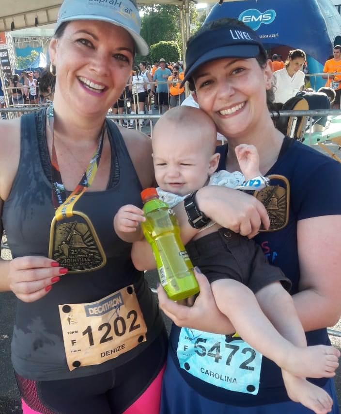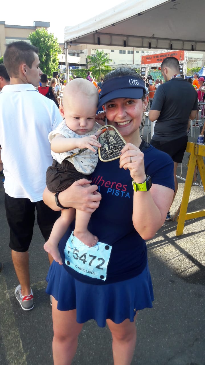 Terminamos a prova de 5k em 43 minutos – o que é muito para o que eu estava acostumada, confesso. Mas estava realizada. Estar de volta depois de uma lesão séria, depois de ganhar um bebê e de ter a vida virada de cabeça para baixo, foi libertador, indescritível. A cereja do bolo? Foram duas: ter meu nome narrado na chegada com toda a empolgação pelo Fabrício, o melhor locutor de corridas, relembrando toda essa trajetória. Um filme passou pela minha cabeça.