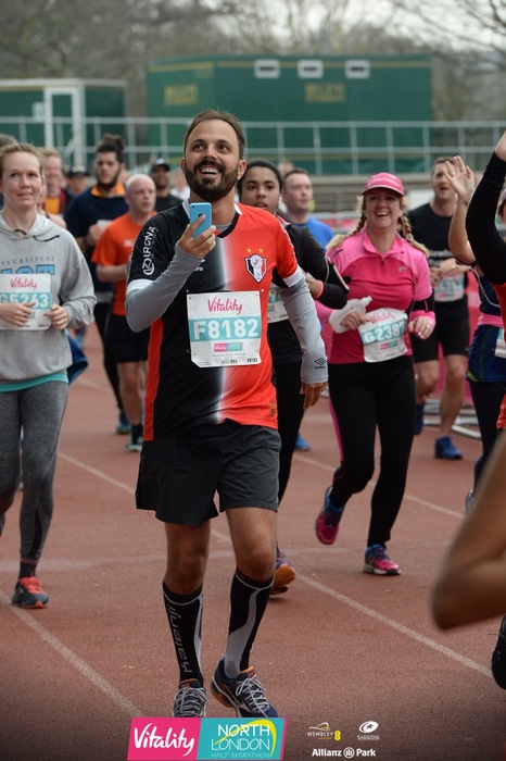 Fomos observando os corredores, os lugares, curtindo as bandas e nos divertindo. A marca de 8 milhas era dentro do Allianz Park, um estádio de Rugby. Passamos pela pista de corrida e um telão na nossa frente trazia o nosso resultado na metade da prova. Foi muito divertido, o telão passava imagens ao vivo dos corredores e o ranking de quem estava cruzando a linha de corte.