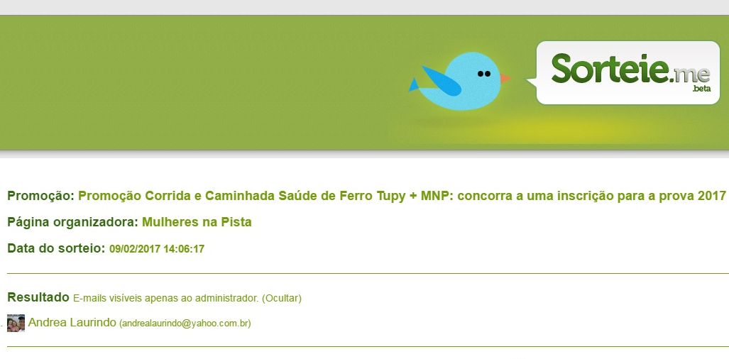 Como a ganhadora do primeiro sorteio declinou do prêmio por morar em São Paulo, fizemos um novo sorteio da inscrição para a Corrida e Caminhada Saúde de Ferro Tupy.