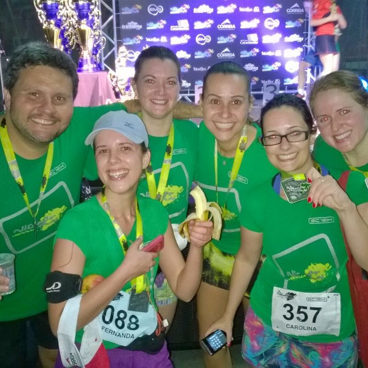 Não me perguntem como, mas comecei a acelerar o passo é na hora de passar na linha de chegada, tava dando um pique daqueles. Foi lindo! Só de tempo de comemorar, abraçar o marido que sempre treina comigo, pe garantiu água, frutas e sair correndo porque a Shica tava chegando!