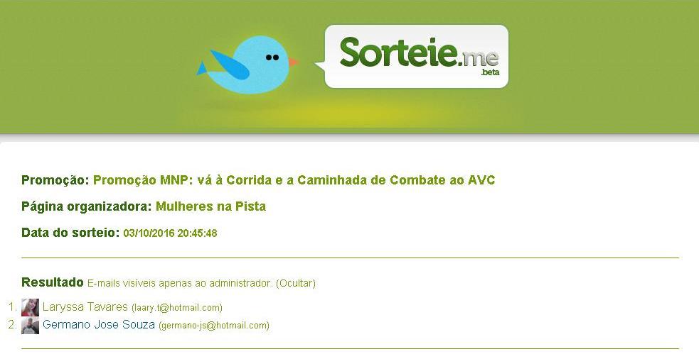Alô, galera! Tudo bem? As inscrições da Corrida e Caminhada de Combate ao AVC esgotaram antes da hora. Então é o seguinte: corremos para fazer o sorteio das duas iscrições e garantir a nossa ida e dos nossos leitores a mais esse superevento. E agora, trazemos para vocês em primeira mão o resultado da promoção.