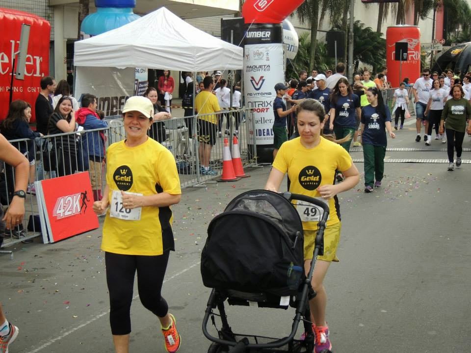 Também vou falar de uma outra mamãe corredora que descobriu o esporte depois dos 50 anos. Minha mamãe! Corremos a primeira prova de 5 km em agosto de 2014, eu, ela e o Caio. Depois ela pegou gosto e está ai, colecionando troféus nos 10 km.